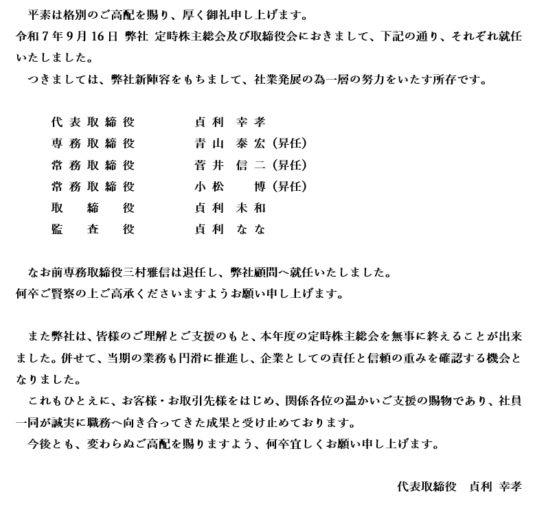 - 新年に際して、代表取締役のご挨拶を「会社方針・メッセージ」に掲載しました。